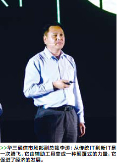 2013年底,华三通信提出“新IT”理念,即通过创新IT推动百行百业的变革,这与国家今年发布的“互联网+”战略不谋而合。2014年,华三通信率先启动向“新IT基础架构供应商”的转型,制定了成长为“新IT基础架构领导者”及“新IT生态圈构建者”的目标,志在通过构建新的IT生态圈,让“新IT”成为驱动各行各业变革与发展的引擎。
