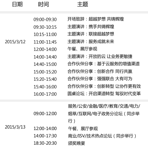 2015华为中国合作伙伴大会将于3月12日至13日举行,届时将向超过5000名合作伙伴传递2015渠道政策、展示华为领先的ICT产品和解决方案,众多合作伙伴将分享和华为合作的实践经验。