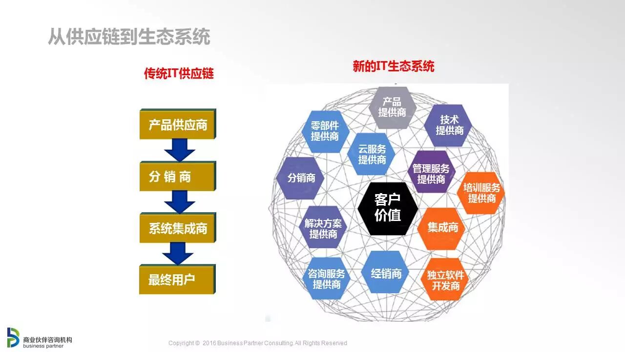 IT市场从渠道时代进入生态时代发表时间:2017-05-16 09:59网址:http://weixin.cnbp.net/Project/2017var500/ (本文为商业伙伴总编辑于洪涛,在2017商业伙伴英雄会上的演讲摘要) “如今,企业的竞争力,不仅取决于自身实力,更取决于生态系统竞争力”,这句很普通的话,今天看起来特别有意义。商业伙伴咨询机构很多年前就开始倡导生态系统的建设。近些年,“生态”已经成为IT市场上的热门词汇。 在“渠道”和“生态系统”之间,还有一个词叫做“合作伙伴”。现在,几乎所有的厂商已经把“渠道大会”改名为“合作伙伴大会”了,甚至今年有个别厂商改名为“生态大会”,这反映出大家对生态系统价值的认同。 转型的三大内外部驱动因素 在我看来,从渠道时代到生态时代的转型,也是从传统供应链到IT生态系统的转变。 传统的IT供应链,是从厂商到用户的线性链条,中间还有分销商和系统集成商等环节。产品自上而下流动,存在明显的上下级关系。而在IT生态系统中,各类不同的企业(包括产品提供商、技术提供商、增值分销商、培训服务提供商、云服务提供商、零部件提供商、解决方案提供商、集成商、独立软件开发商、咨询服务提供商、经销商等)之间是平等合作的网状关系,通过相互合作共同创造“客户价值”。