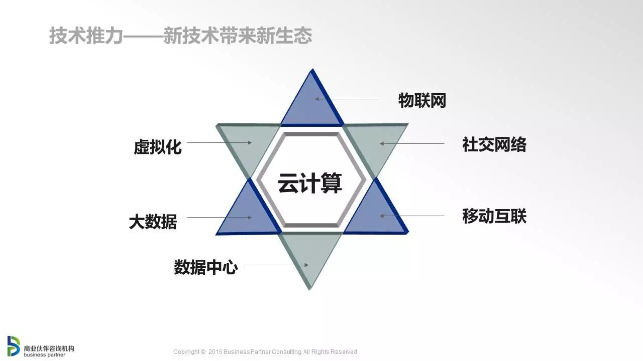 驱动这一转变的是三大力量:客户业务转型的拉力、新技术新应用的推力,以及企业自身的成长压力。 其中,企业业务转型所带来的应用模式和采购模式的转变,是最重要的驱动因素。 伴随着“数字化转型”或“互联网+”,IT正在从企业的支撑工具,变成业务创新的动力,因此,很多的IT需求不再是来自IT部门,而是来自业务部门;需要的也不再是产品,而是应用和解决方案;方案商为客户交付的不再是项目,而是服务。 与此同时,以云计算为核心,大数据、物联网、移动应用、社交媒体等新技术新应用的兴起,也带来了新的业务模式,产生了各自不同的生态图谱。在这方面,商业伙伴咨询机构也进行了很多的研究,为不少新兴企业或传统企业新兴业务,提供了咨询调研服务。