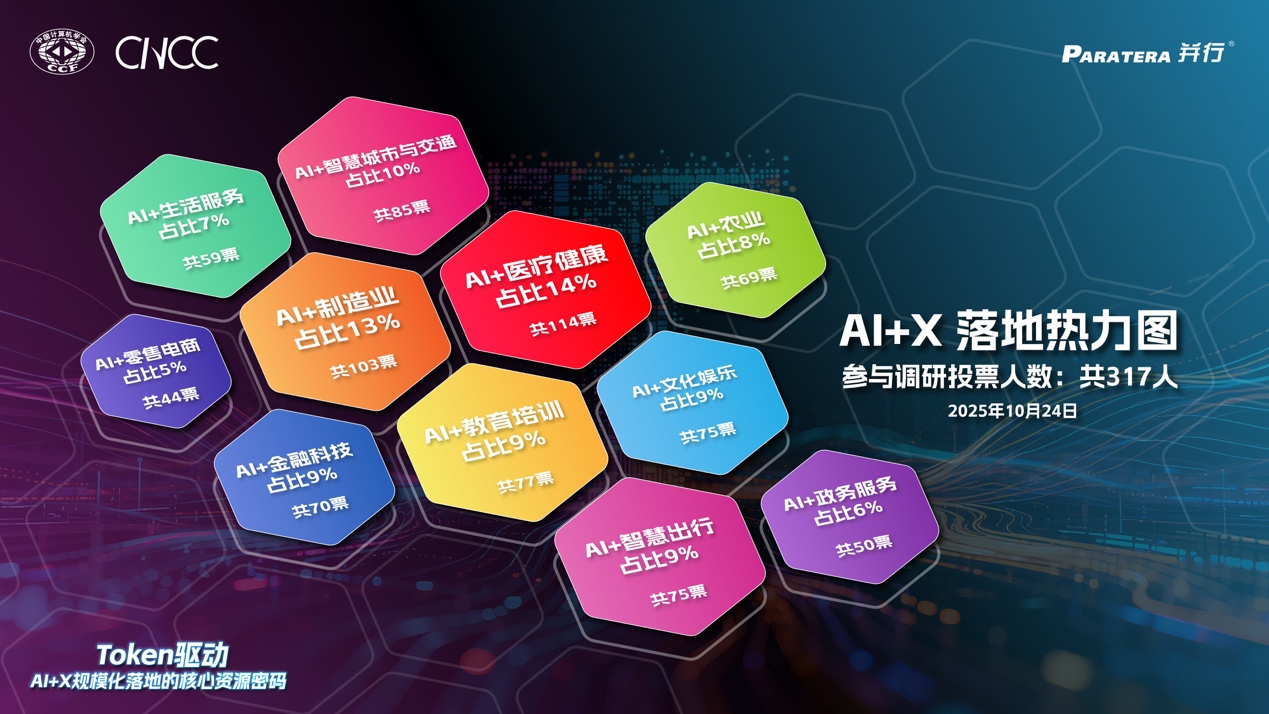在论坛的结尾,陈健博士发布了由并行科技市场部特别策划、300多位专业人士投票参与的“AI+X落地热力图”,揭示了AI在医疗健康、制造业、智慧城市与交通、金融科技、教育培训、文化娱乐、智慧出行、生活服务、政务服务、农业、零售电商等各领域的落地渗透程度与发展潜力,其中医疗健康与制造业凭借政策支持力度大、场景需求明确,成为 AI 落地热度最高的两大领域;智慧城市与交通、金融科技等紧随其后,在技术成熟度与市场需求的双重驱动下展现出强劲发展势头;而农业、零售电商等领域随着Token驱动机制的完善与智算资源的进一步下沉,未来有望实现快速的突破。